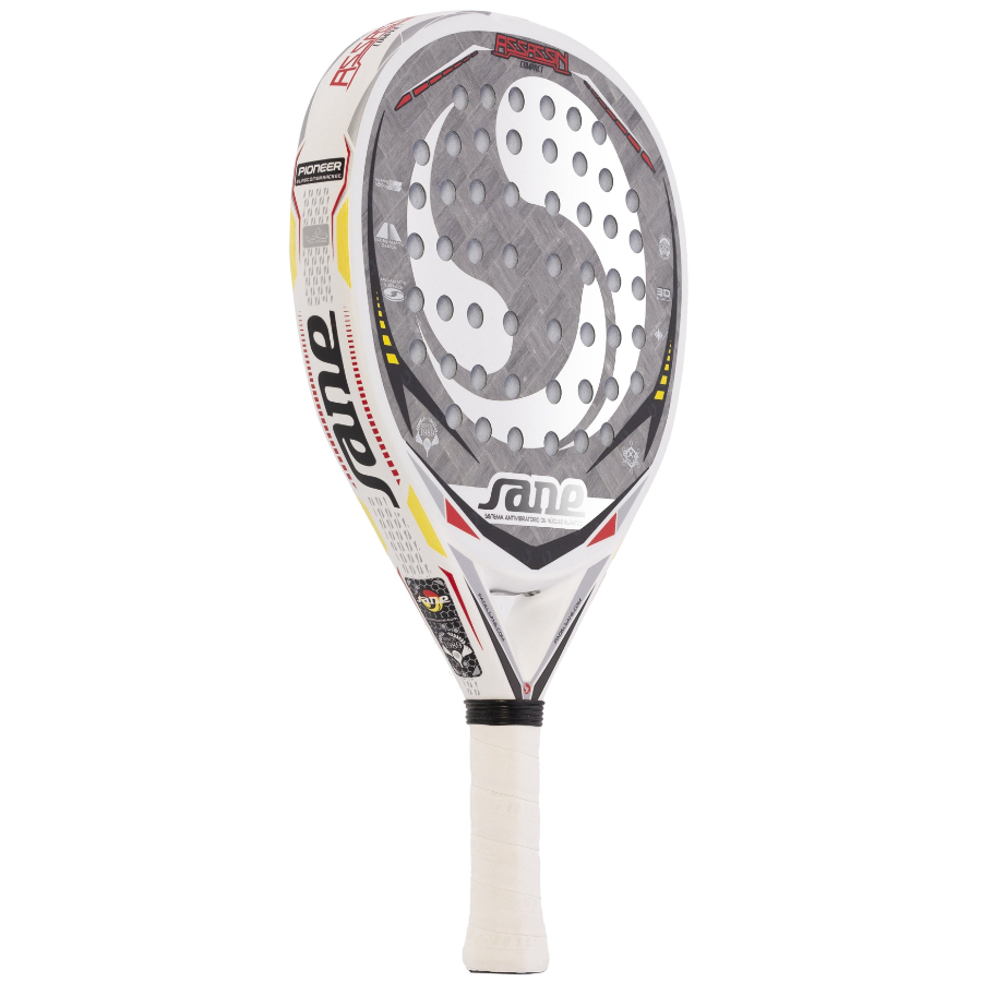 Sane Assassin Compact White yra SANE 2021 kolekcijos flagmanas. Jis turi 45° 12K aliuminiu sustiprintą TEXTREME struktūrą, blizgios ir matinės apdailos derinį bei 3D tekstūrą, kuri pagerina kamuoliuko sukibimą. Inovatyvi EXA HOLES gręžimo sistema optimizuoja optimalią smūgio zoną, užtikrindama išskirtinį našumą kiekvienu smūgiu. Ši raketė sujungia pažangiausias technologijas ir išskirtinį dizainą, todėl ji idealiai tinka reikliems žaidėjams.